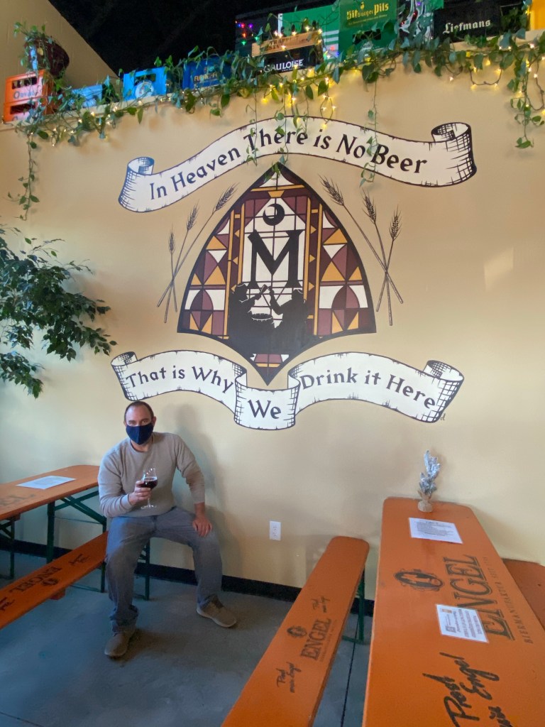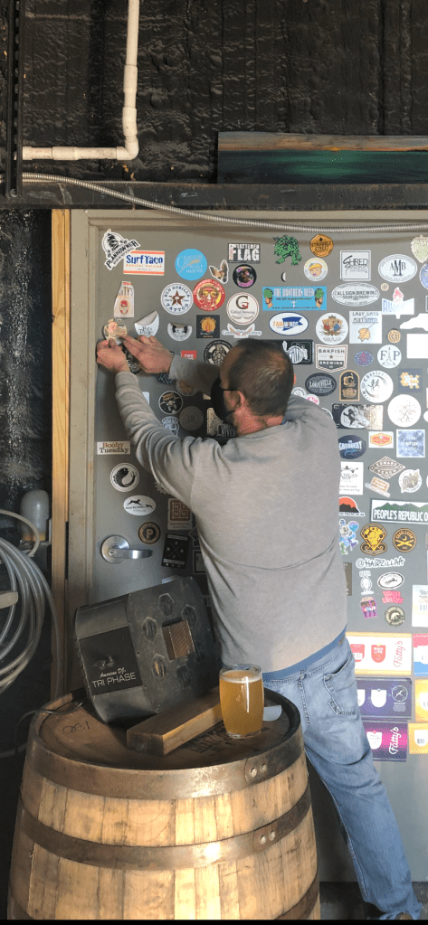 Then we walked to Fatty’s Beer Works where I ordered Boombox Apocalypse, another IPA with Sabro hops. I told you I like that hop! It’s a hop that releases coconut, tropical and stone fruit flavors. The coconut came through nicely! I also placed my sticker on their wall!