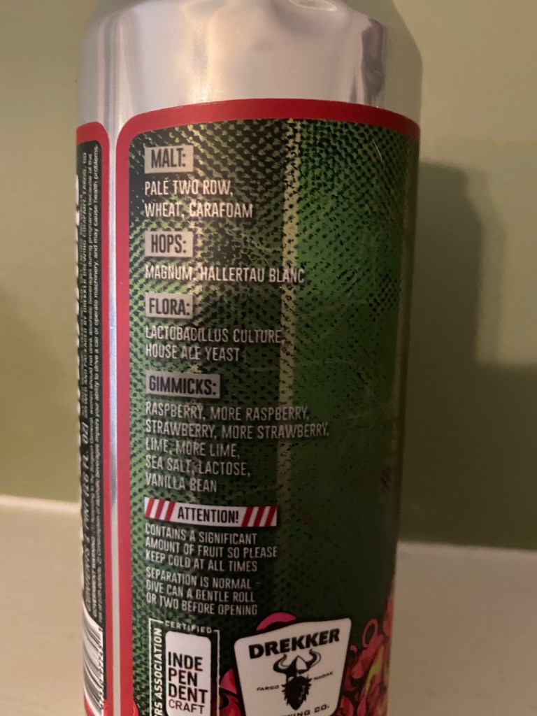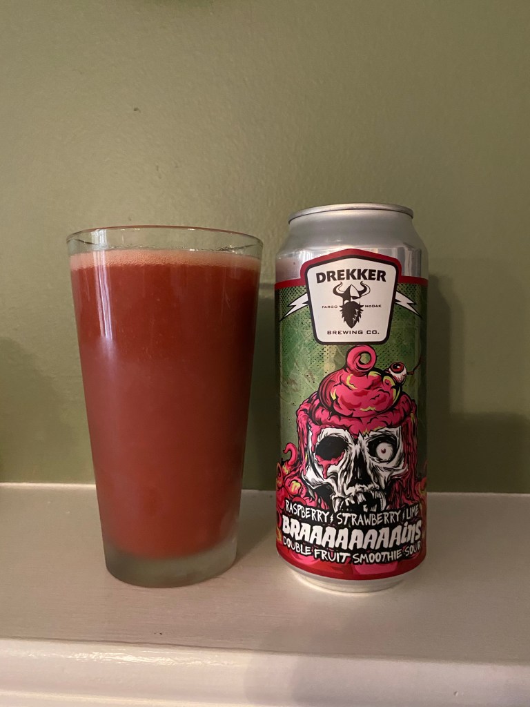 Drekker is known for their sour beers. This is one of their Braaaaaaaans series. This edition is brewed with raspberry, strawberry and lime. It is a double fruited smoothie sour. They used Magnum and Hallertau Blanc hops. Sea salt, lactose and vanilla bean were also added. You should give the can a “gentle” roll before opening according to the can.